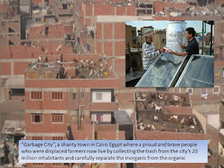 Garbage, I learned there was no such thing. These people eke out a living by taking all the so called trash from the rest of Cairo and turning trash into cash. Sure, they need infrastructure and support to make the process cleaner and healthier, but with their animals in the city they actually do a better job of recycling than any other city on earth -- and they eat meat every day since they keep goats and chickens and cows and rabbits and sheep on their rooftops and inside their apartments.
