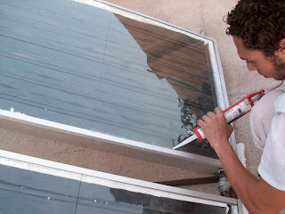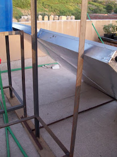 Figure 6 shows the construction of the solar collector itself. This is fairly standard: a box made of 1 mm aluminum sheets (1 x 2 meter, bent into a box) filled with styrofoam sheet insulation on the back and the sides, with welded copper pipe attached to guttered aluminum strips painted black, covered with glass, with special sauce on a sesame seed bun. We've also made the collector box out of wood and recycled pressed plastic sheets, but aluminum is the quickest, easiest and lightest. We make our absorber plates out of aluminum strips (preferred) but we've also made them out of recycled butter tins, soda cans and other thin scrap metal. When all is said and done, we find it simplest to buy 1 mm 1x2 aluminum sheeting for the box and .5 mm aluminum sheeting for the absorber fins to save on labor and for durability.