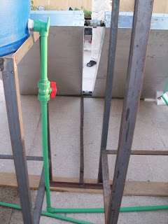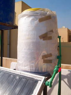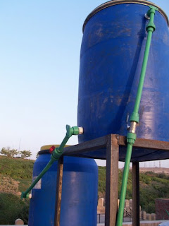 (Note: We use the less expensive 1/2" Zahran float valve (picture left) for the cold water tank because we aren't concerned about flow rate filling the tank with cold water, which only occurs when the neighborhood has water pressure anyway (the soap suds in the picture are because we use recycled shampoo barrels that always have residue of shampoo in them. It is safer than using barrels that contained chemicals, and you don't have to wash them out. For the first few days you also don't have to use shampoo!) For the hot water tank (picture right) we use the larger 3/4" float valve between the cold water inlet and the hot water tank (note the green 3/4" polypropylene pipe descending to the bottom of the tank) so that water flows in as fast as it flows out through the 1/2" outlet to the household shower. We found that due to the long drop to the household the water would drain faster than it was being replaced if both were 1/2". The disadvantage, though, is that the 3/4" float is very large and takes up space that could be used for hot water. We sacrifice about 25 liters because of this. A better solution would be to find a way to use the float from the 1/2" valve with the mechanism from the 3/4" system, but they do not work together. Inventor Magdy Zahran tells us that a redesign would require expensive retooling and the market for do-it-yourself solar systems is of course too small. So it appears we are stuck with this compromise!)