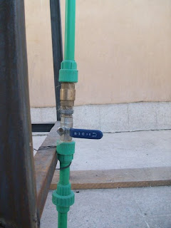 Figure 8 Shows the placement of the valves in the system. It is critical that one put a one-way valve before the cold water tank inlet (not shown) to keep water from backflowing when there is no water pressure (a daily occurence in inner-city Cairo). Another one-way valve is needed somewhere along the hot water outlet pipe to the house to prevent water cold water from backflowing into the hot water tank if the plumbing in the household isn't properly done (as is often the case). Too often, in a country with bad materials like Cairo, a family's faucet mixer will break and the cold water will go up the hot water pipe and flood the roof if there is no one way valve. We recommend AGAINST placing the valve as shown in the picture, so close to the tank because their isn't sufficent pressure to open it. A better placement is actually IN the bathroom, where it can easily be serviced, or at least at the lowest accesible point on the roof before the hot water pipe goes down to the household.