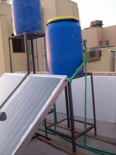 Figure 2 shows the critical placement of the two recycled plastic shampoo barrels that make up our system, giving maximum flow and thermosiphoning.
