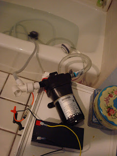 The set-up is very very simple (see picture). The pump (which is very very quiet) sits on a table in the bathroom. it is connected to a little 12 volt battery which will be recharged by the solar panel. It has an on off switch and a 10 amp fuse in line with the positive wire. The water intake is fitted with a 1/2 inch hose adapter and 10 feet of hose. At the end of the hose is the in-line water filter that Flojet makes for the pump. This prevents hair from getting into the pump. The water outflow is a 1/2 " thread connector connected to two flexible shower hose for length (joined by a male-male 1/2 " nipple). Before the shower head itself I put a fixture that lets me turn the water on or off; this also turns on and shuts off the pump automatically without having to get out of the tub to flick the switch on the battery until I'm nice and dry (the pump senses a lack of water flow and shuts off by itself).