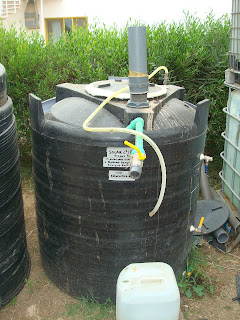 Altitude: about 12 meters. You have to climb a couple of flights of stairs. You will also be rewarded by the sight of Cairo's first space saving solar HW system that hangs off the roof rather than taking space on the roof. Hussain and his brother Hamdi and family have a small metal workshop on the ground floor where they have begun to manufacture hand-made Solar Hot Water systems for sale to villas outside of Cairo. Very entrepreneurial, they also sell the liquid fertilizer from the biogas system to rooftop gardeners and florists for 1 LE per jerry can.