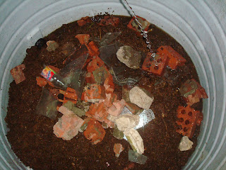 Photo: Hussain puts flower planters on top of the digester as weights to increase the pressure pushing the gas down to his stove in his apartment below. Culhane discusses the need to build a cage support to hold the gas collector stable.