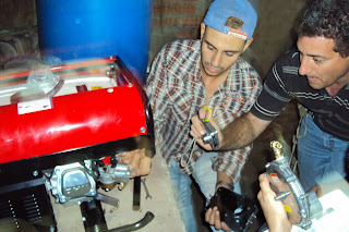 Photo: Innoventors Ayman Fathy and T.H. Culhane run a converted 4 stroke 6.5 HP Engine Electric generator on the biogas produced from yesterday's kitchen garbage.